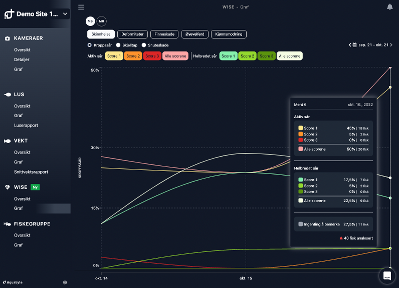 I tillegg til skinnhelse, så overvåker og identifiserer WISE alle de andre observerbare velferdsindikatorer. Verktøyet gir også en løpende overvåkning av velferds-status i merden. Du får kunnskap for alle de velferdsindikatorene du trenger. Skinn, øye, deformiteter, finner og kjønnsmodning. Når du trenger det.