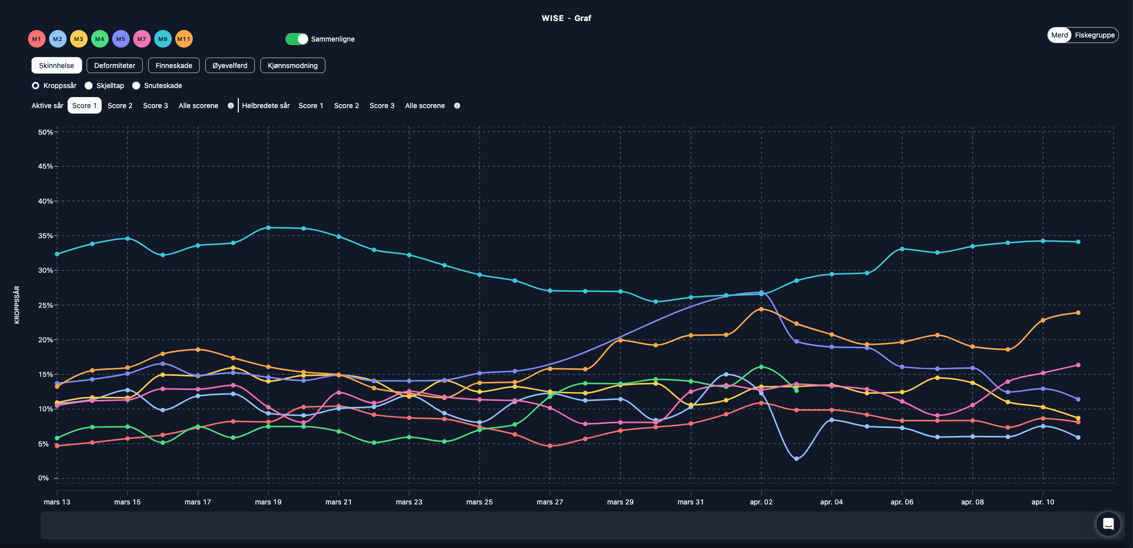 I Aquabyte WISE Velferd vises status for velferdsindikatorene i et oversiktlig grensesnitt som gjør det enkelt å identifisere helsetilstand på merdnivå og å sammenligne status i forskjellige merder. Grensnittet gir også kontinuerlig informasjon om superior-andel, med detaljert informasjon om hvilke nedgraderinger som er beregnet. Kriteriene for nedgradering kan settes individuelt.